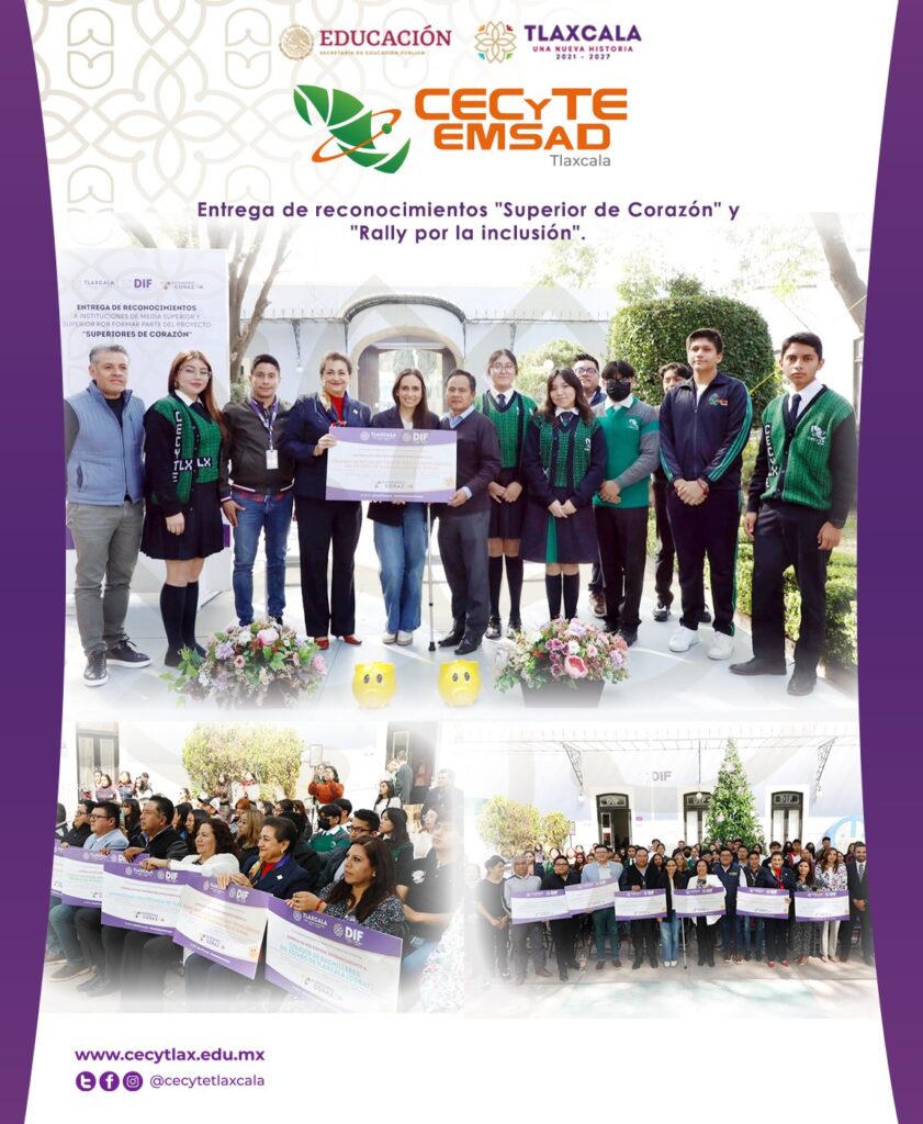 Abrazamos la diversidad y resaltamos el compromiso de ser “Superior de Corazón”. Celebramos la entrega de reconocimientos por parte de la presidenta honorífica del SEDIF Tlaxcala, Mariana Espinosa de los Monteros Cuéllar, a las y los directivos, alumnas y alumnos que participaron en el Rally por la Inclusión. #CompromisoCumplido#UnNuevoCECyTE #UnNuevoEMSaD#UnaNuevaHistoria